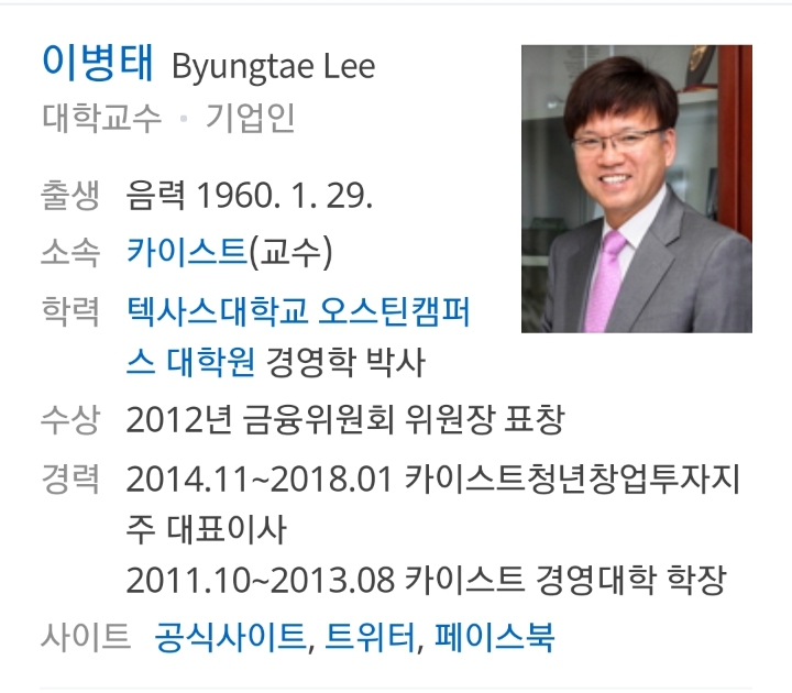 정신줄을 놓은 카이스트 교수, 세상이 바뀌었으면 힘 센놈 미국한테 붙어서 친미했어야지 이병태 교수. 공식 홈페이지에 따르면, 정보 경제학, it 비즈니스 전략, 비즈니스 애널리틱스, 사회적 경제가 주된 연구 분야이며, 주요 대기업 및 금융기업 등 산업체에서 자문 활동을 한 경력이 있다.